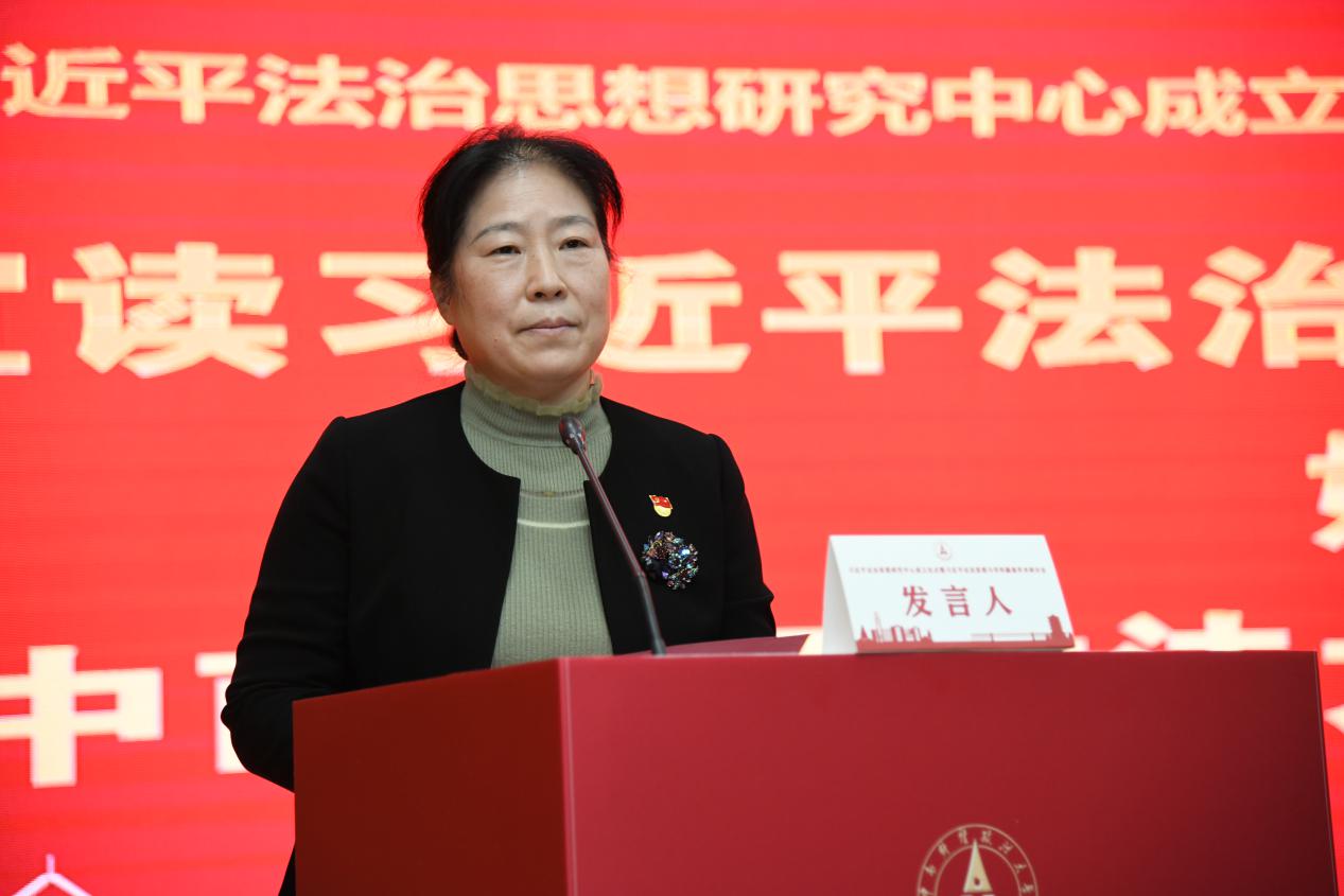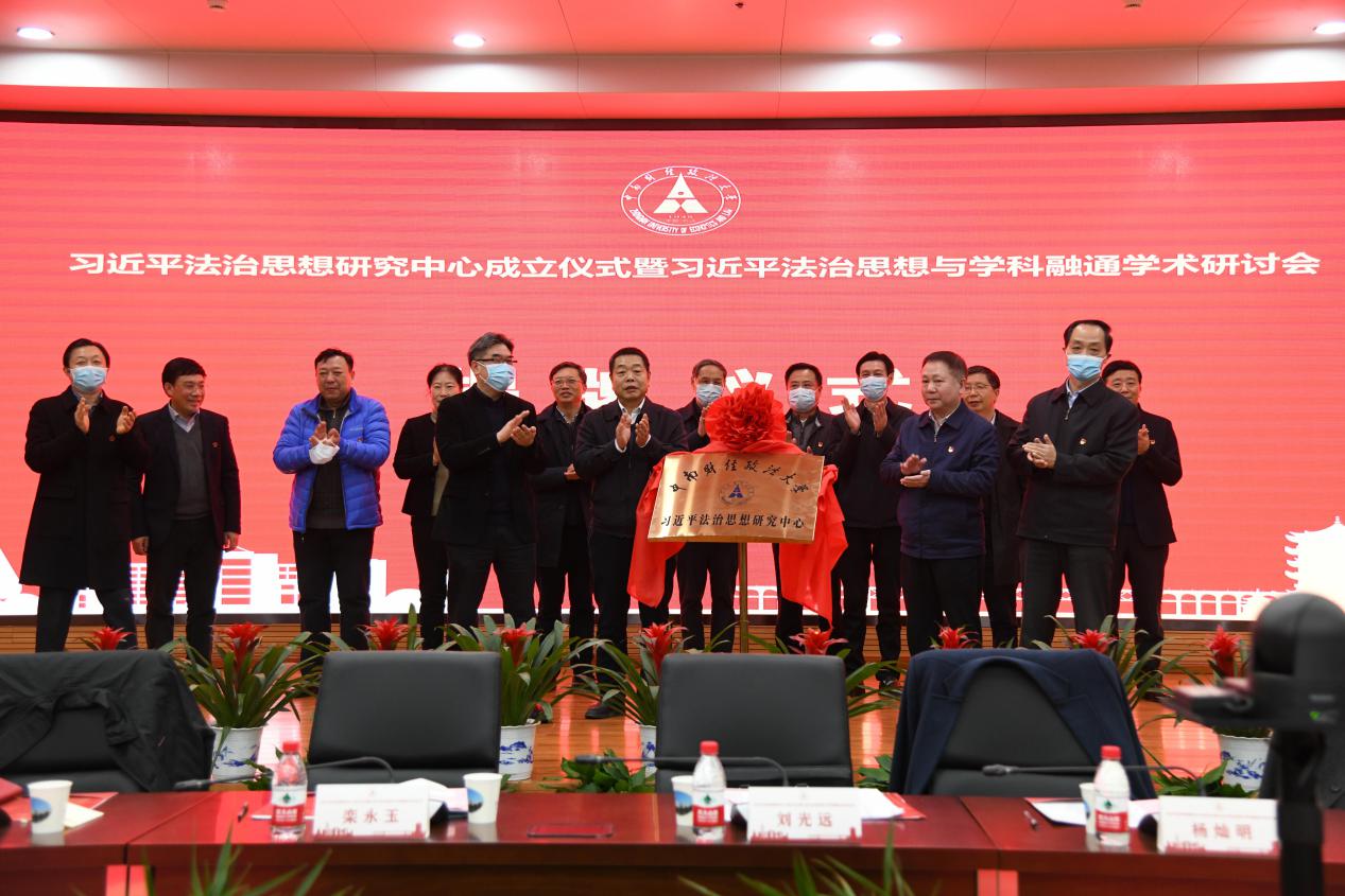 姚莉宣读“习近平法治思想研究中心”成立文件。出席领导上台为“习近平法治思想研究中心”揭牌。