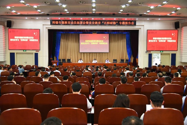 新闻网讯(通讯员 张立 摄影 徐志持)6月1日上午,学校在文泉楼学术报告厅召开师德专题教育部署动员会暨党史学习“百师研修”专题报告会。校党委书记栾永玉,校党委副书记陈明,校党委常委、副校长闫平出席会议,学校师德建设领导小组成员,各教学单位党委委员,系、部、中心主任,教师党支部书记,近五年入职的海外留学归国教师,共计200多人参会。会议由校党委副书记陈明主持。