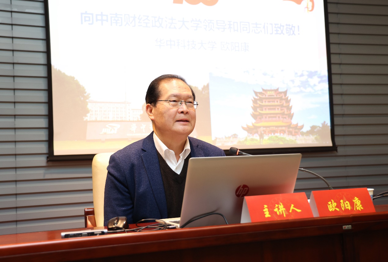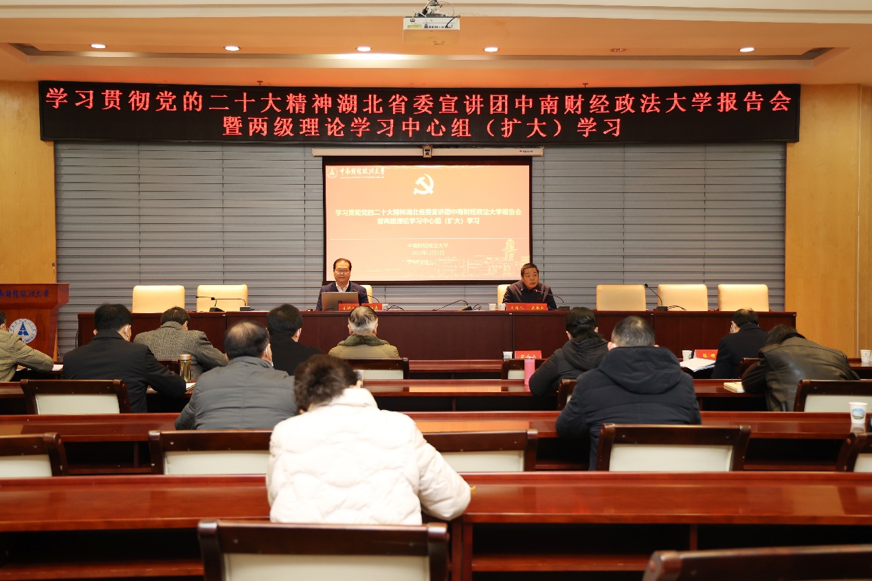 新闻网讯(通讯员 杜玥 摄影 李嬴)12月1日上午,学习贯彻党的二十大精神湖北省委宣讲团走进中南财经政法大学。省委宣讲团成员、华中科技大学国家治理研究院院长欧阳康教授以《以中国式现代化全面推进中华民族伟大复兴--学习贯彻党的二十大精神 强化民族复兴的使命担当》为题作辅导报告。学校党委委员、纪委委员、宣讲团代表,在主会场参会,各二级单位中心组成员通过线上收看方式在各单位分会场参会。校党委书记栾永玉主持会议。