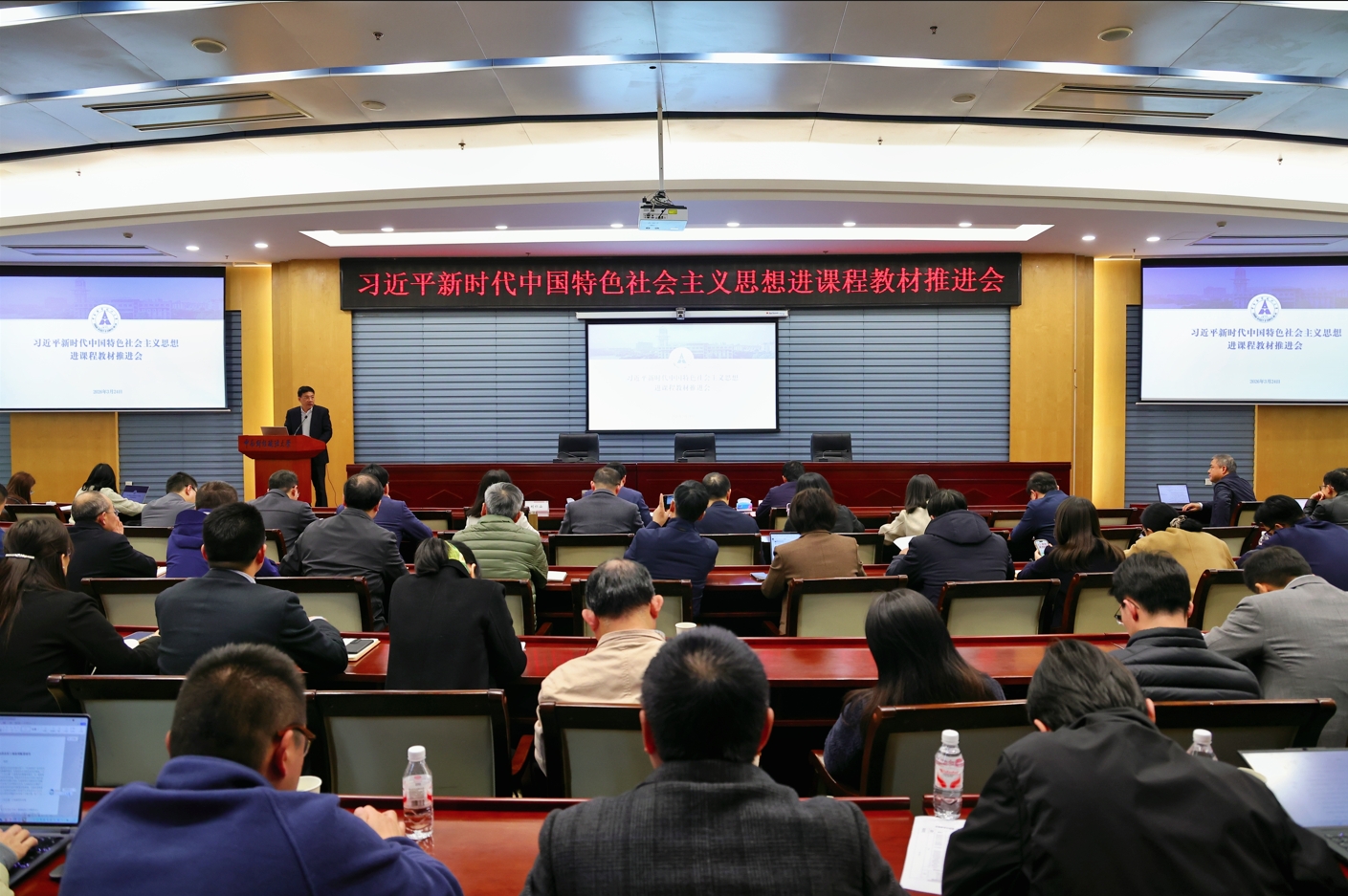 新闻网讯(通讯员 谢吉 摄影 杜鹏)3月24日下午,学校召开习近平新时代中国特色社会主义思想进课程教材推进会。校长、党委副书记朱方伟,党委常委、副校长刘仁山,党委常委、副校长陈柏峰出席会议。相关职能部门和全体教学单位负责人,相关课程负责人和学生代表参加会议。会议由刘仁山主持。