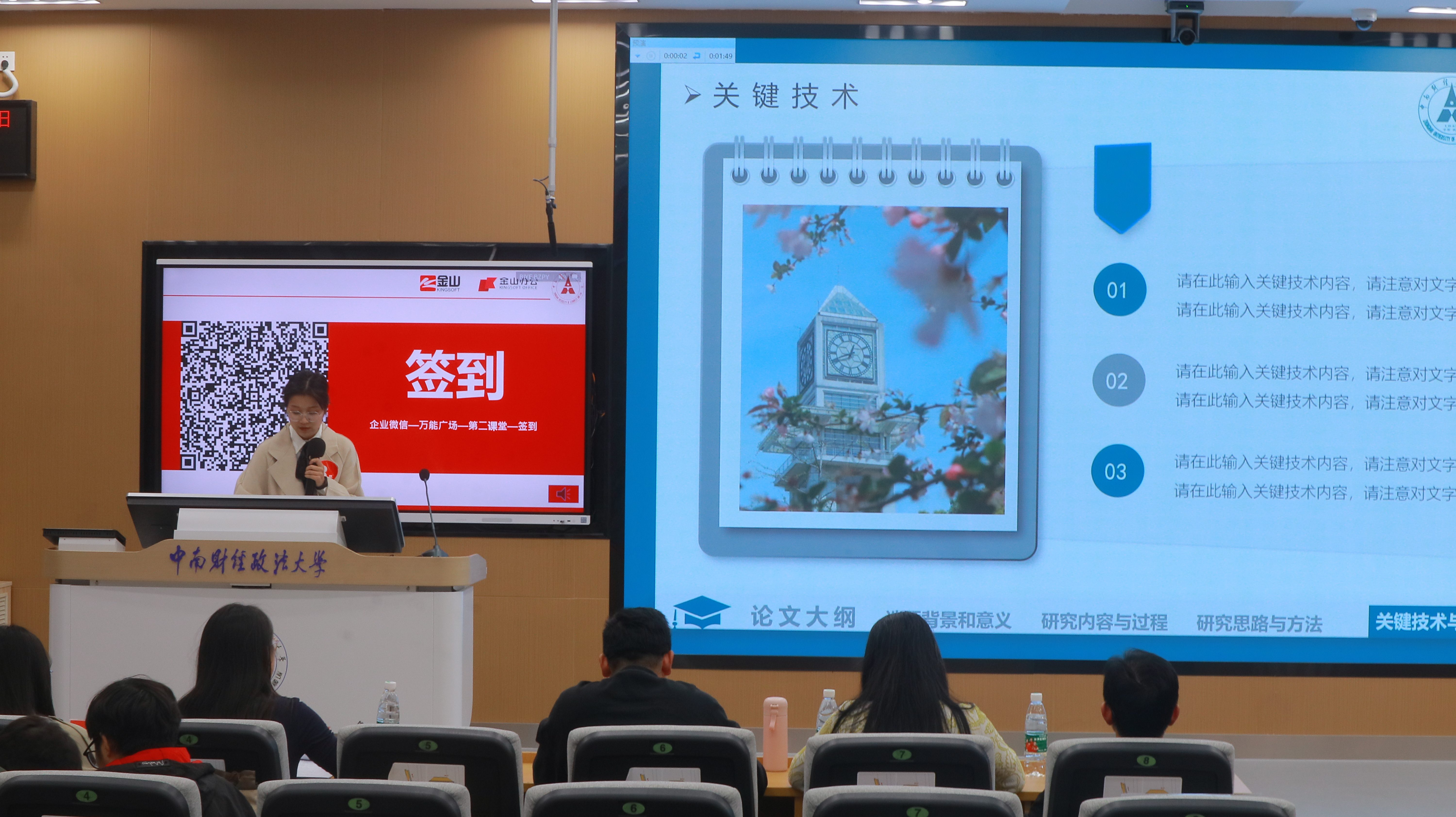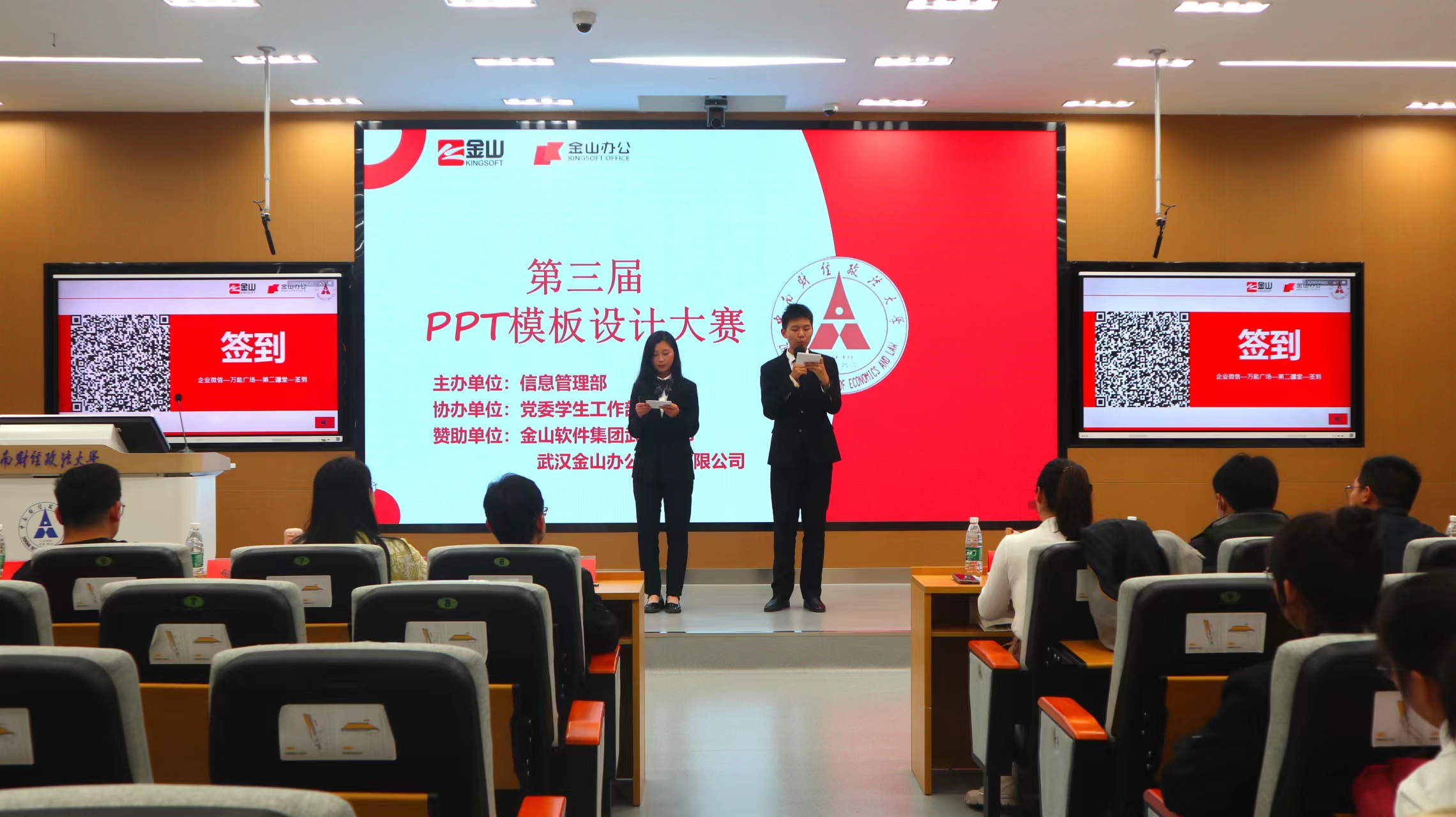 11月23日,决赛在文波112智慧教室举行。金山办公客户成功部总经理储皓、北京金山办公软件华中区销售总监周元晟、党委学生工作部副部长兼学生资助管理中心主任石凌、信息管理部副部长郭翼飞出席本次活动,金山软件教育合作部经理王佳慧、金山办公运营部经理安婧、校工会、妇女办公室主任付瑜、教务部办公室主任王颖、党委学生工作部学习发展中心主任黄艳、信息管理部网络技术中心主任尹文皓、外国语学院团委书记吴章凡、信息管理部正版软件及WPS项目负责人高艺菡、党委学生工作部学习发展中心郭小义、信息管理部信息技术中心李林燕担任评委。