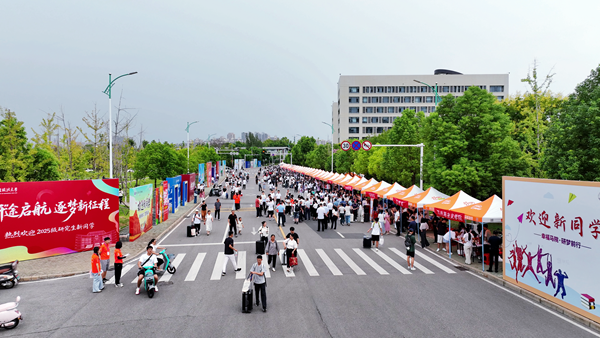 校园内郁郁葱葱、生机勃勃,迎新主干道上人流如织,道路上方悬挂着迎新横幅,各学院精心布置的迎新点前人潮涌动,处处洋溢着欢迎新生的氛围,迎新各项工作井然有序。