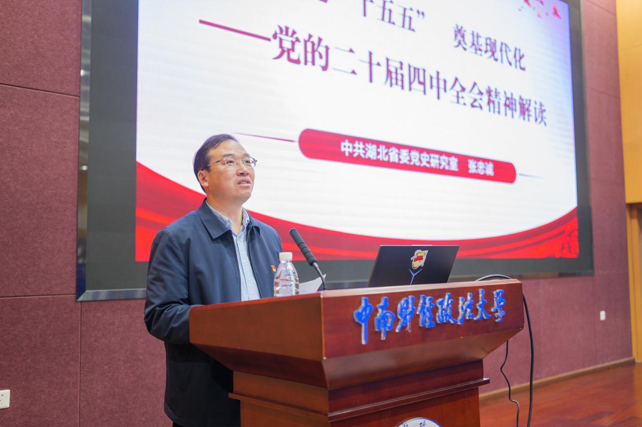 新闻网讯(通讯员 范梦宇 穆会玲 季明珠)12月11日下午,工商管理学院在文瀚楼北报告厅举办党的二十届四中全会精神等系列专题学习活动。中共湖北省委党史研究室副主任张忠诚受邀为学院师生作专题辅导。活动由学院党委书记余小朋主持。
